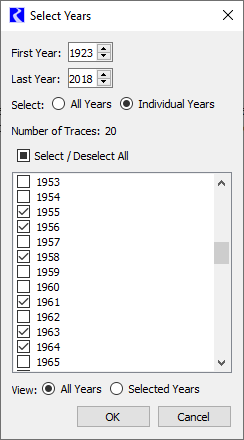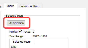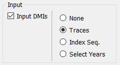 When a DMI is added as an input ensemble, it defaults to using all of the traces defined in the ensemble. The Number of Traces column shows the number of traces for each DMI. When an item having traces is selected in the list, the Select Traces button is enabled. Select this button to open a dialog showing all of the traces for the ensemble, and choose a subset of traces as desired.