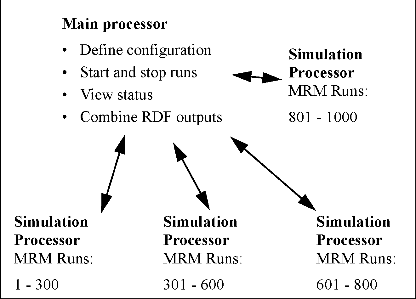 Each simulation processor then executes the MRM runs that the controller gives it to execute. Each processor runs one or more MRM runs that consist of a portion of the total number of concurrent runs. This is shown graphically in the screenshot. In this example, there are 1000 runs that are distributed unequally to four processors.