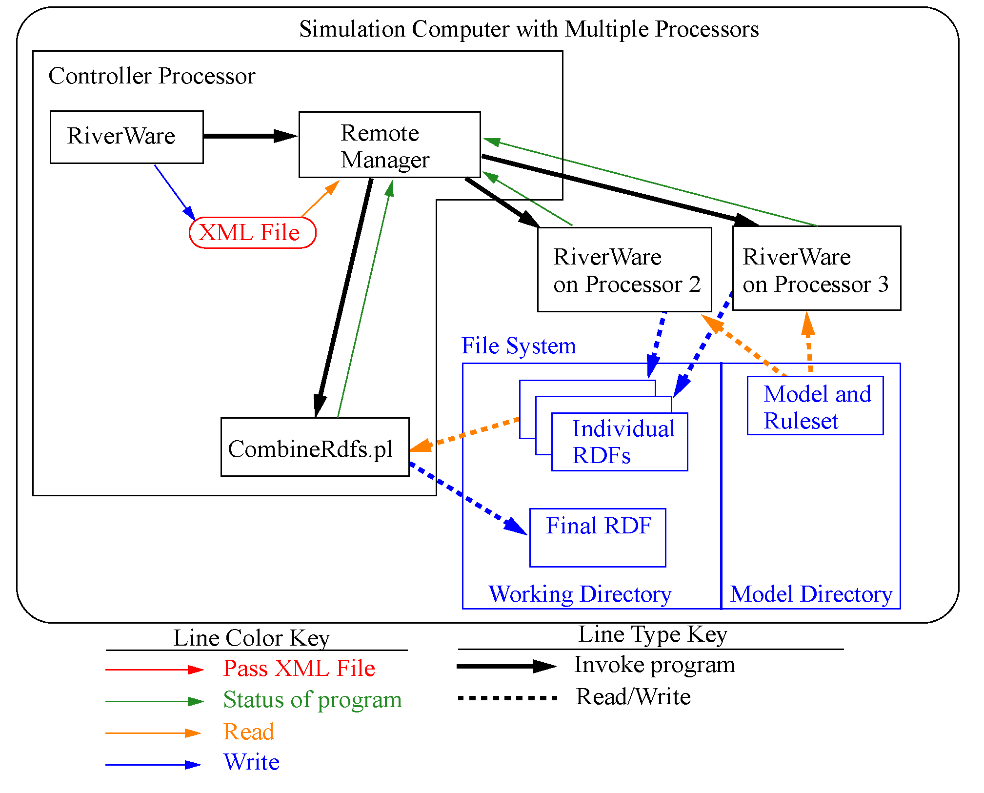 • For each simulation, connects to the simulation processor, writes the XML configuration, and reads RiverWare’s output (which it uses to update its status dialog).