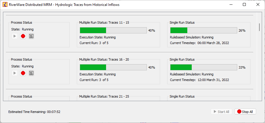 5. Select Start on the Multiple Run Control Dialog. RiverWare will start the Distributed MRM Controller.