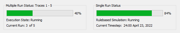 The Multiple Run Status and Single Run Status panels (which are very similar to RiverWare’s run status dialog) display the progress of each MRM run and each individual run: