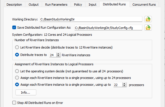 There are three options for how the distributed RiverWare instances are assigned to individual processors