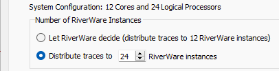 • Let RiverWare decide. RiverWare will set the number of RiverWare instances equal to the number of cores. The model can be moved to different computers and the configuration will update based on the number of cores on that computer.