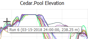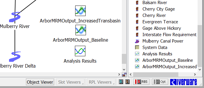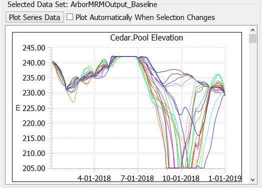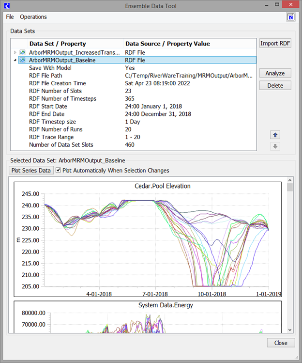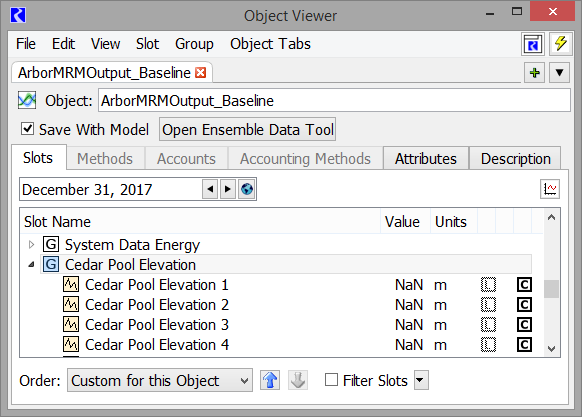 Ensemble Data Sets are simulation objects. For example, the data are represented as slots, sometimes referred to as “data set slots”, which can be either series, scalar, or table. An Ensemble Data Set can be opened in the Object Viewer and allows access the wide range of RiverWare functionality that applies to slot data. For example, you can visualize ensemble data in plots or canvas charts and write their data using DMIs or model reports.