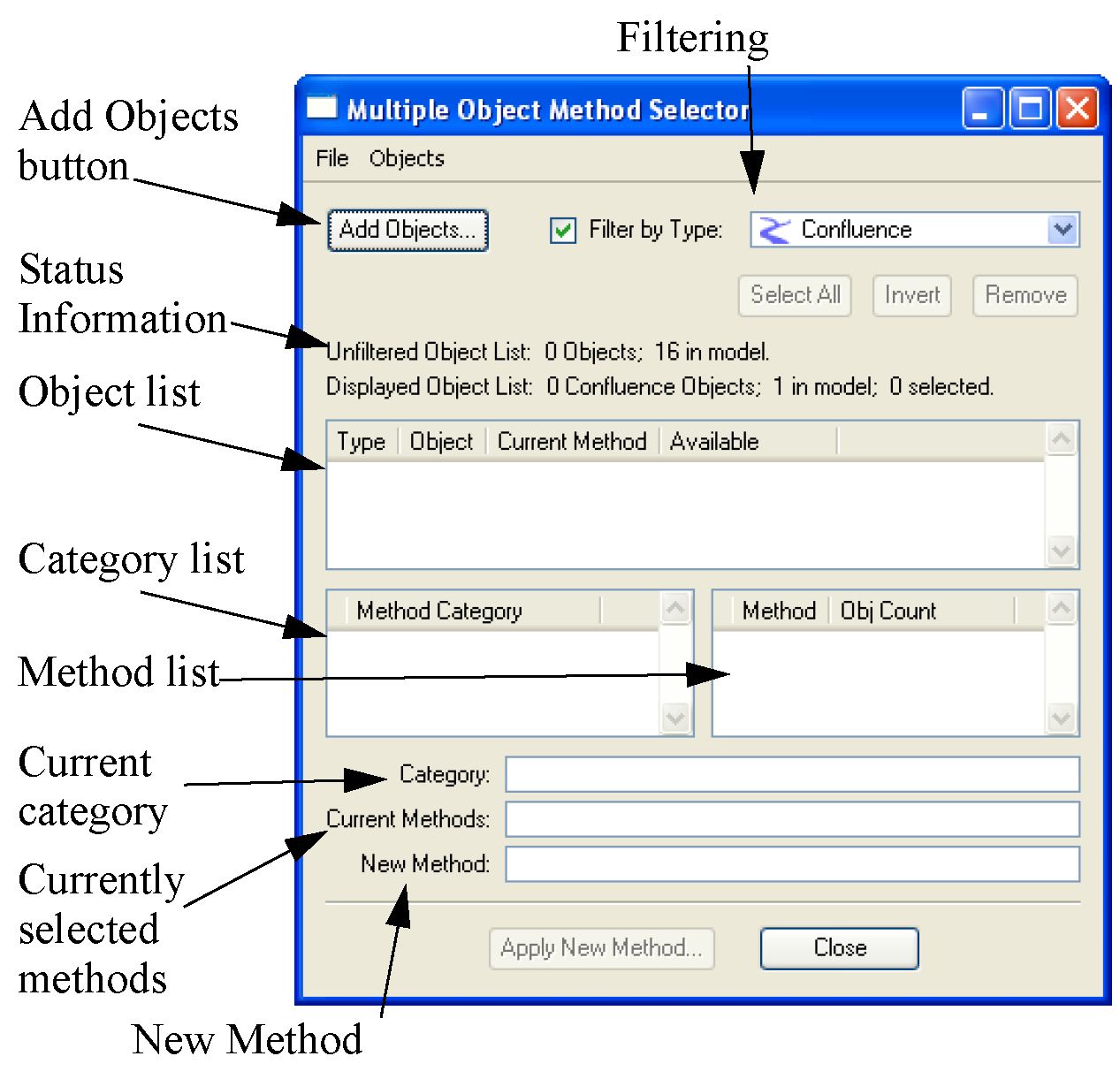 These steps are accomplished using the three sections of the dialog. The dialog is designed so that the user progresses from top to bottom with each successive task. From top to bottom, we will refer to these sections as: Object List, Category List, and Method list.