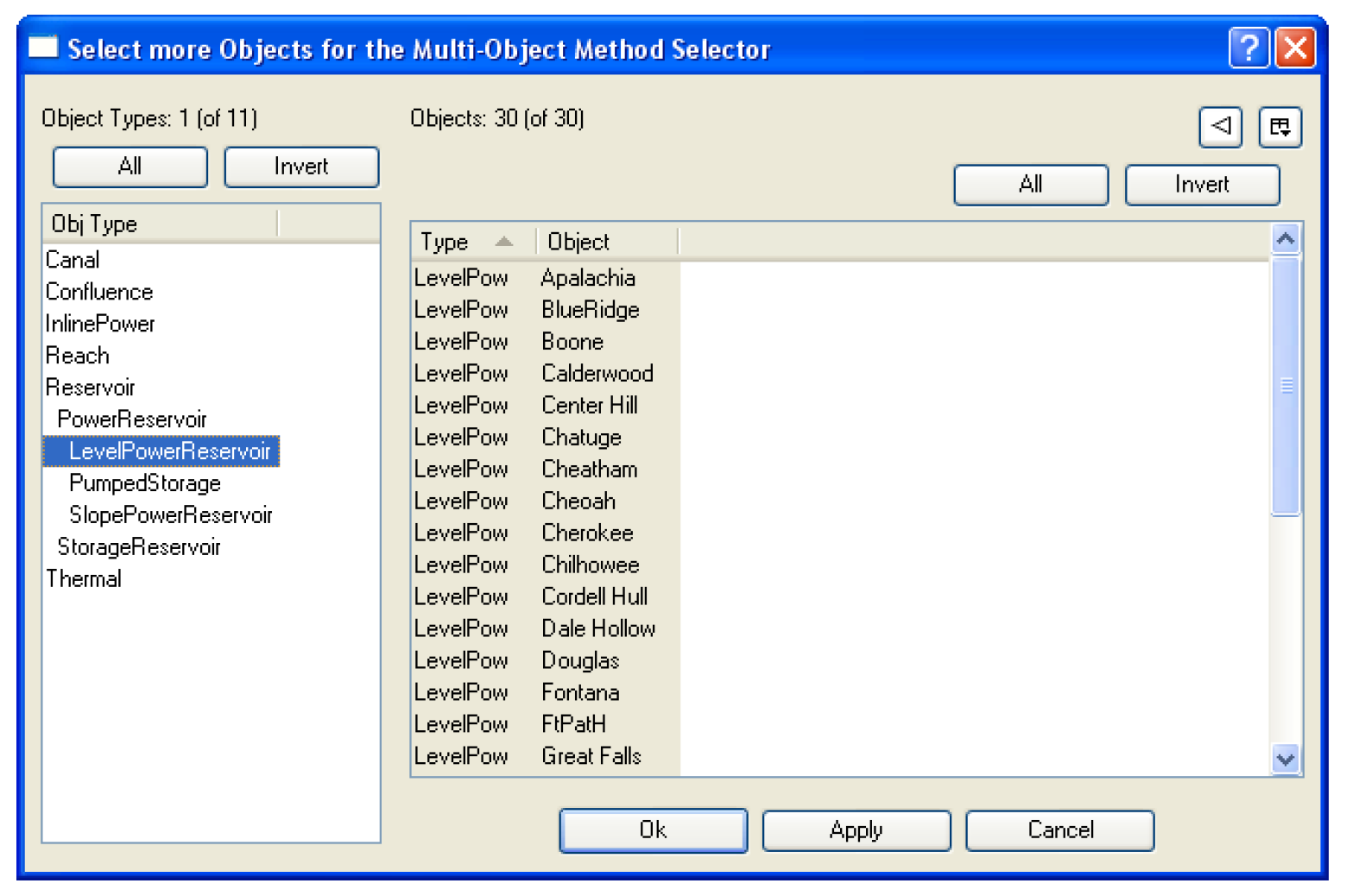Note:  Regarding aggregate objects, parent aggregate objects and their child segment objects appear as separate items in this object selector dialog. The parent object will appear as an object of the aggregate type. The child objects will appear as objects of their individual type. For example, an AggReach with 2 child/segment objects are treated as follows: the parent object is an object of type AggReach; the 2 child objects are objects of type Reach. They can each be added by selecting the given type then the given object.