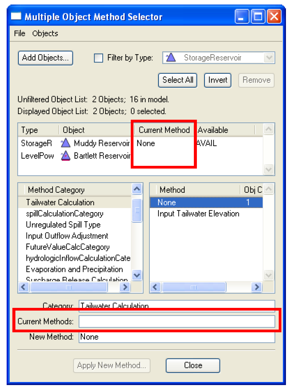 Before the Multiple Object Method Selector dialog box was available, a user had to select methods from the Open Object dialog for each object. For example, if a new engineering method was developed for use for all reservoirs in basin, a user would have to select this new method on each Reservoir object. For large models, this could be a tedious and time-consuming task. The purpose of the Multiple Object Method Selector is to allow the user to set an engineering method for a group of objects from a single dialog.