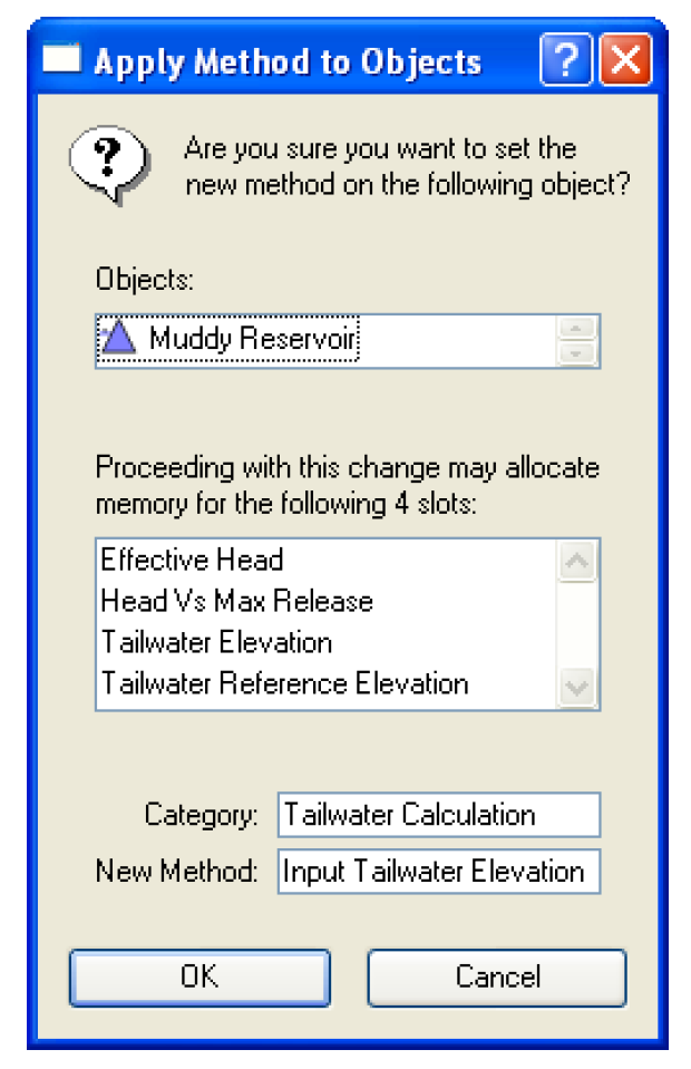 After the new method has been applied using the Apply New Method button, a confirmation dialog appears. This dialog lists all the objects which will have this new method activated. This is the selected objects the list that have the desired category and method available. Canceling this dialog will prevent the method from being changed on any of the objects. Also, the dialog informs the user of the new slots which may be instantiated when this new engineering method is activated. Canceling this dialog will prevent the method from being changed on any of the objects.