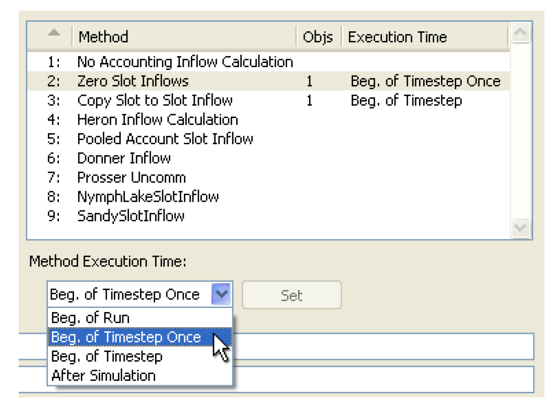 • By selecting the Set button next to the Method Execution Time selector. This effects the methods on the objects currently having that method setting.
