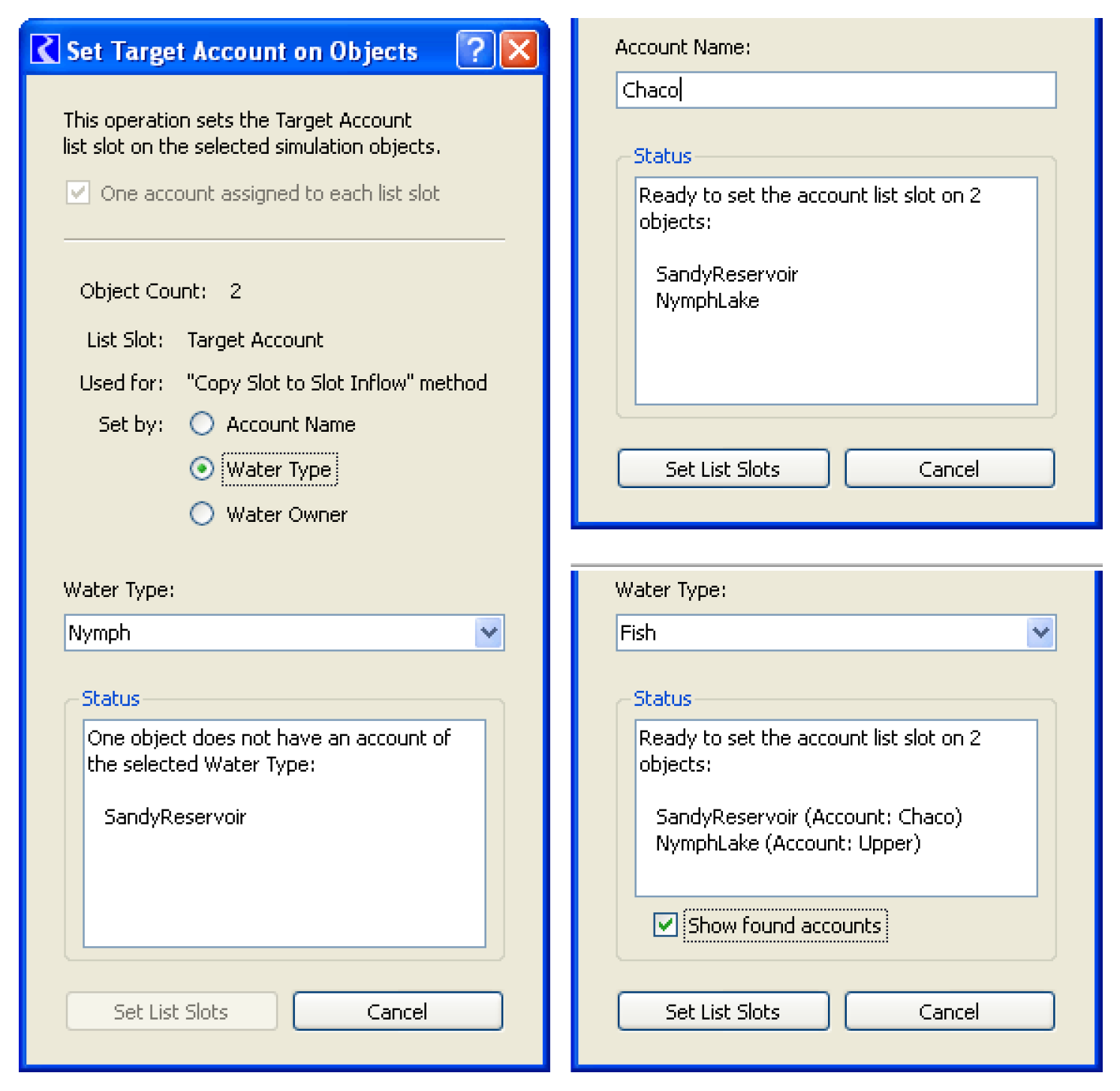 In the case of the Set List Slots operation being ready (i.e. exactly one Account matching the entered criteria for each simulation object), the Status panel enumerates the simulation objects; see Figure 5.21. Otherwise, the Status panel enumerates the simulation objects which either have no Accounts matching the criteria, or have more than one Account matching the criteria. Additionally, when the Water Type or Water Owner criteria are selected, the names of the matching Accounts can optionally be shown.
