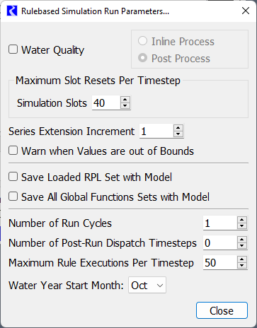 The Number of Post-Run Dispatch Timesteps parameter represents the number of timesteps past the run finish timestep for which object dispatching will be allowed. Whether an object dispatches or not still depends on the knowns and unknowns, i.e. the dispatch conditions. Also, additional data may be required for the objects to correctly dispatch and solve. Data defaults (like reservoir diversion) will be set past the end of the run, too. Note, the Number of Post-Run Dispatch Timesteps is controller specific, that is, it can be different for the Simulation and Rulebased Simulation controllers.
