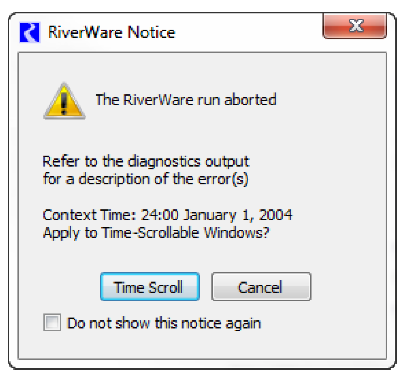 • Do not show this notice again. Request that the dialog not be shown again. If this box is selected, then subsequent aborts will use the same selection (Time Scroll or Cancel) and the dialog will not be shown. This applies only to the current RiverWare session.