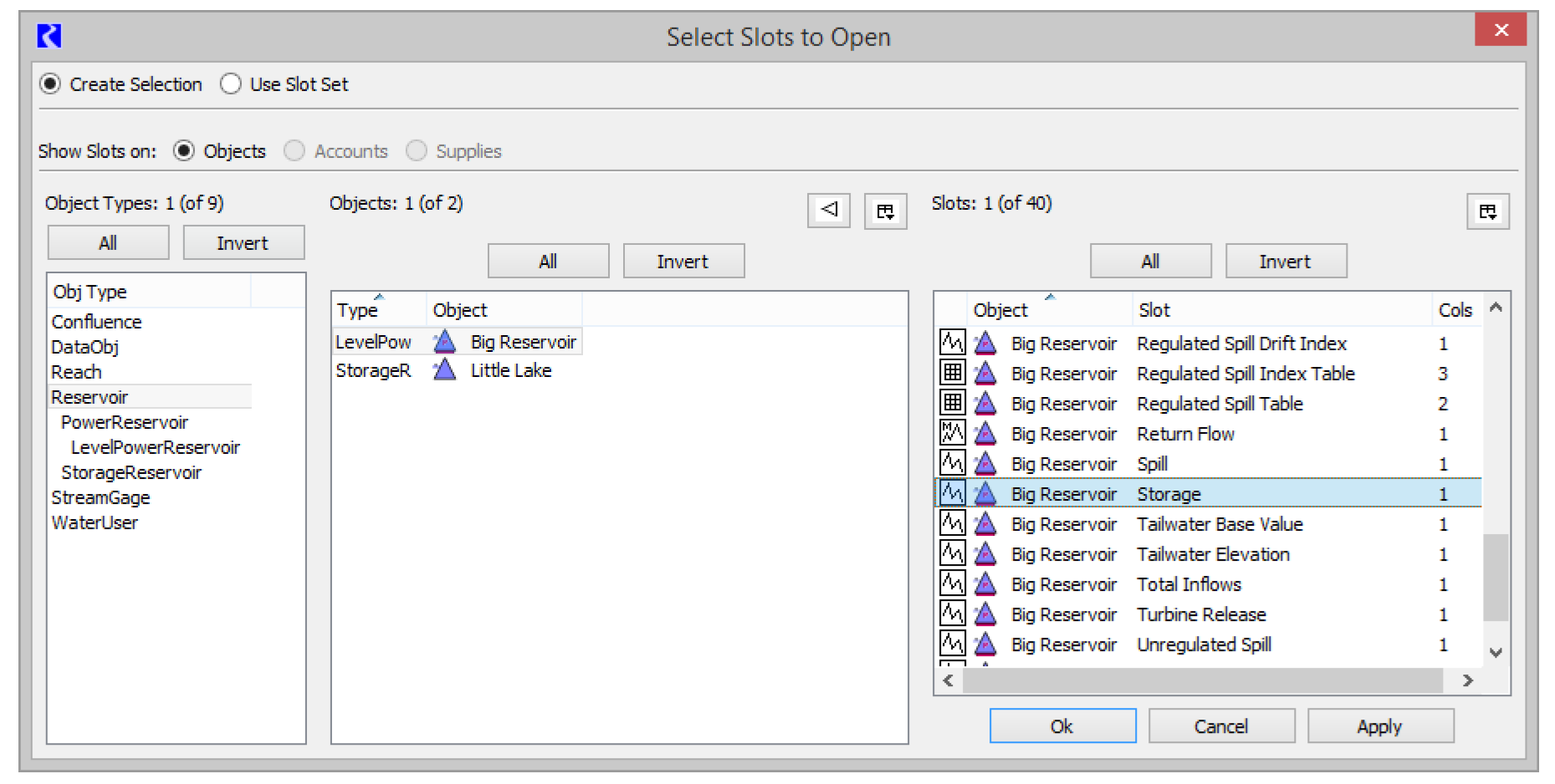 Displaying items is accomplished from general to specific. If the user is selecting a slot, they first start on the left by highlighting one or more Object Types, and then they are able to highlight a specific object or set of objects, and then they are able to highlight the specific slot or set of slots on those objects. These items are displayed by selecting the appropriate Object Types, Objects, and Slots or using the All buttons to select all. In Figure 8.1, we have highlighted all Reservoirs (including Level Power and Storage) in the left most pane. Then we have highlighted the Big Reservoir object in the center pane. Shown in the right pane are all of the slots on this object.