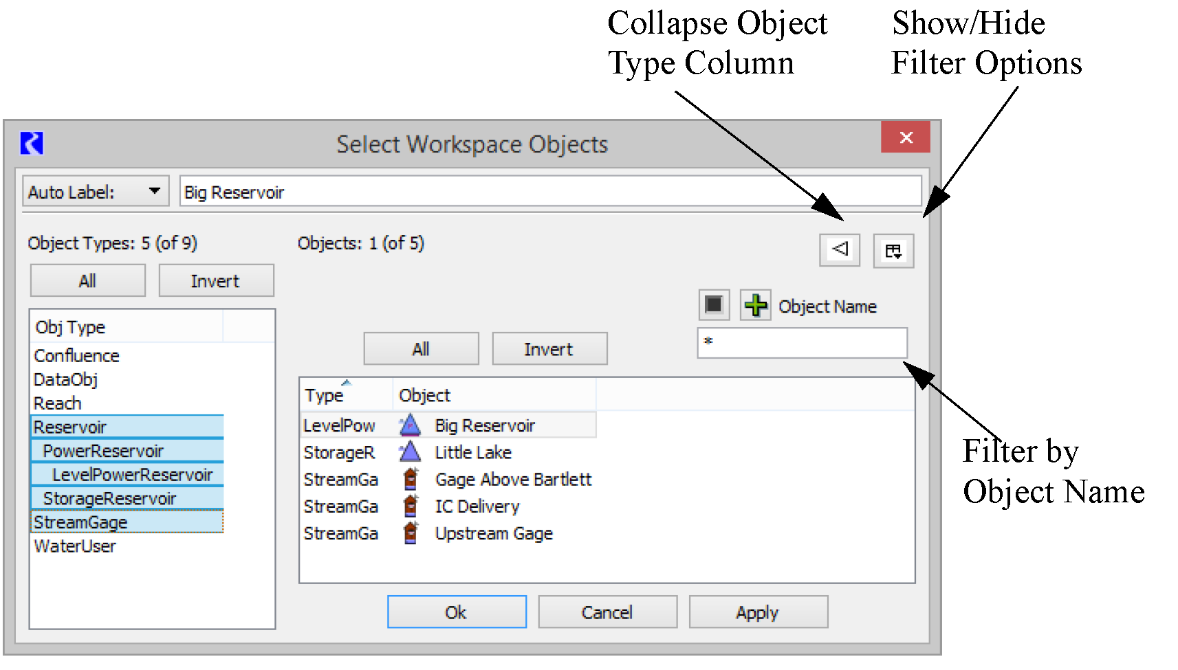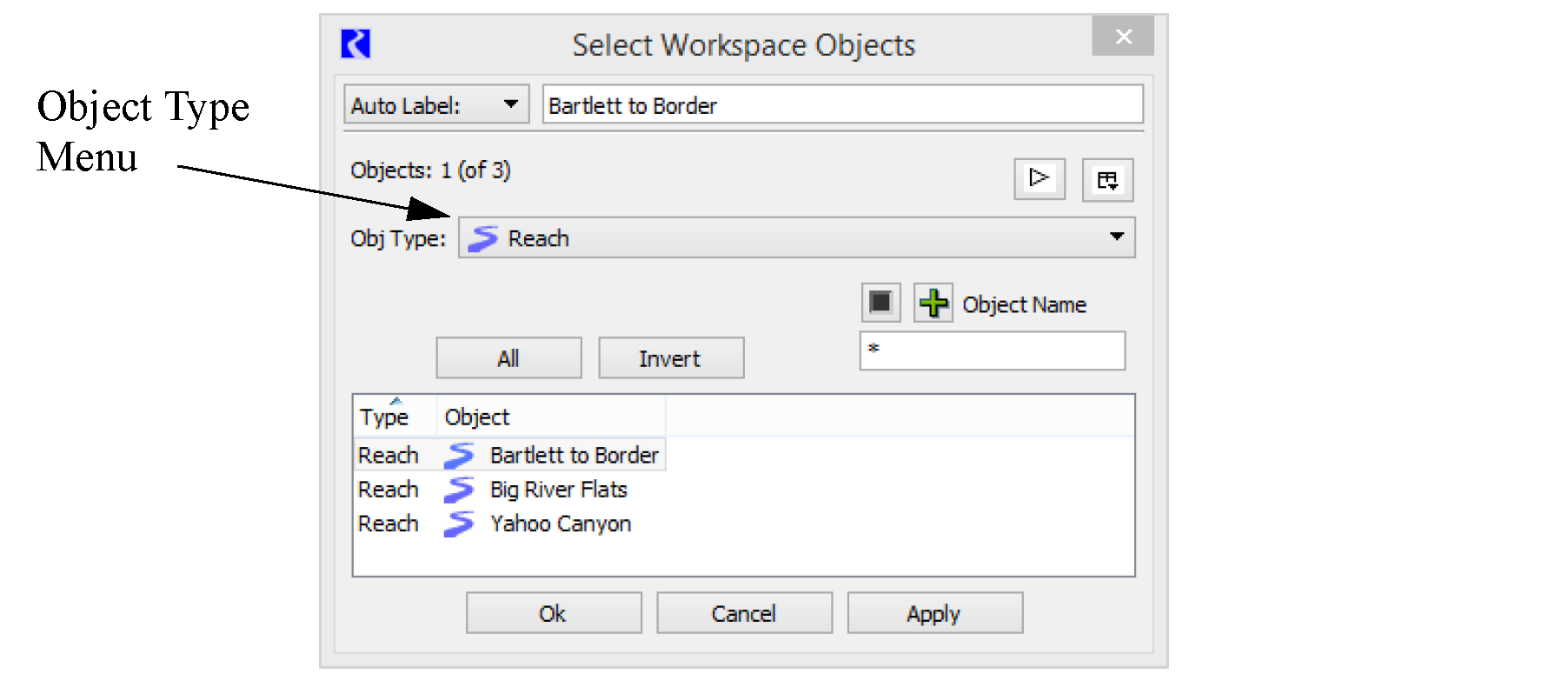 The Object Name filter field allows the user to type a part of the object name and use wildcard symbols (i.e. *) for name completion. For example, typing Lake* in the Object Name field will display only those objects that begin with “Lake”. By default, a * exists in the Object Name field and all objects will be displayed.
