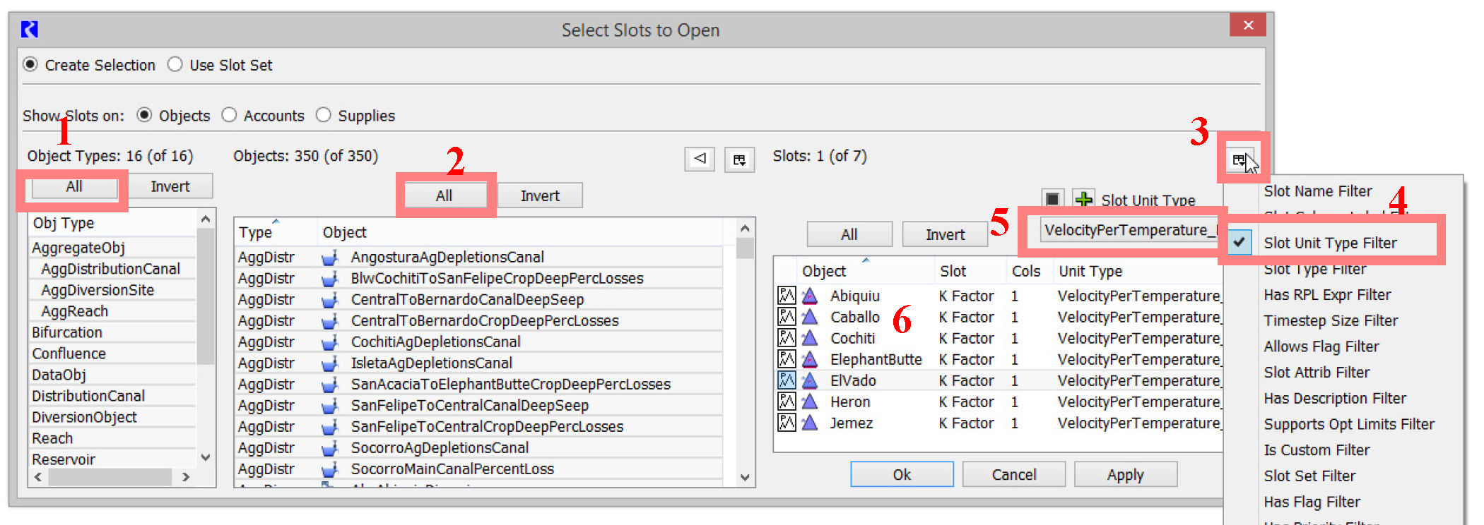 4. Any slots that appear in the slot area (6) have this unit type. Select one of them, and select OK to bring up the Open Slot for that slot. If you were making this selection from the SCT, you would have been able to select all and then show them in the SCT. To find slots that have a different attribute (or multiple attributes) use any of the other filters. For example, you could enable the Slot Name Filter and find only slots that have a certain name.
