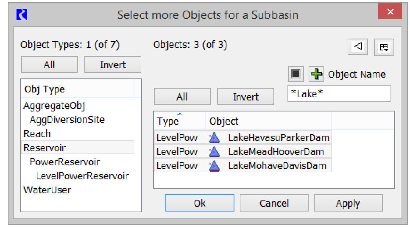 In this example, we will use the selector to create a subbasin of all of the reservoir objects with the word “Lake” in their name.