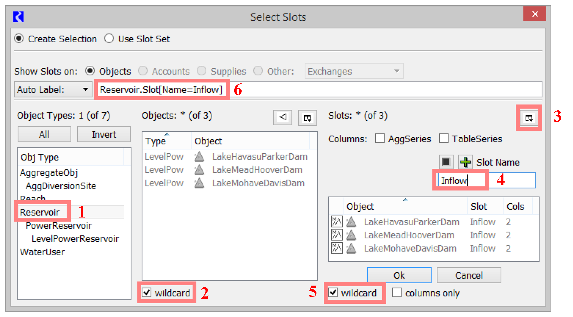 2. In the center pane, Objects, select the Wildcard button on the bottom center (2). This specifies that we will do this for any reservoir.