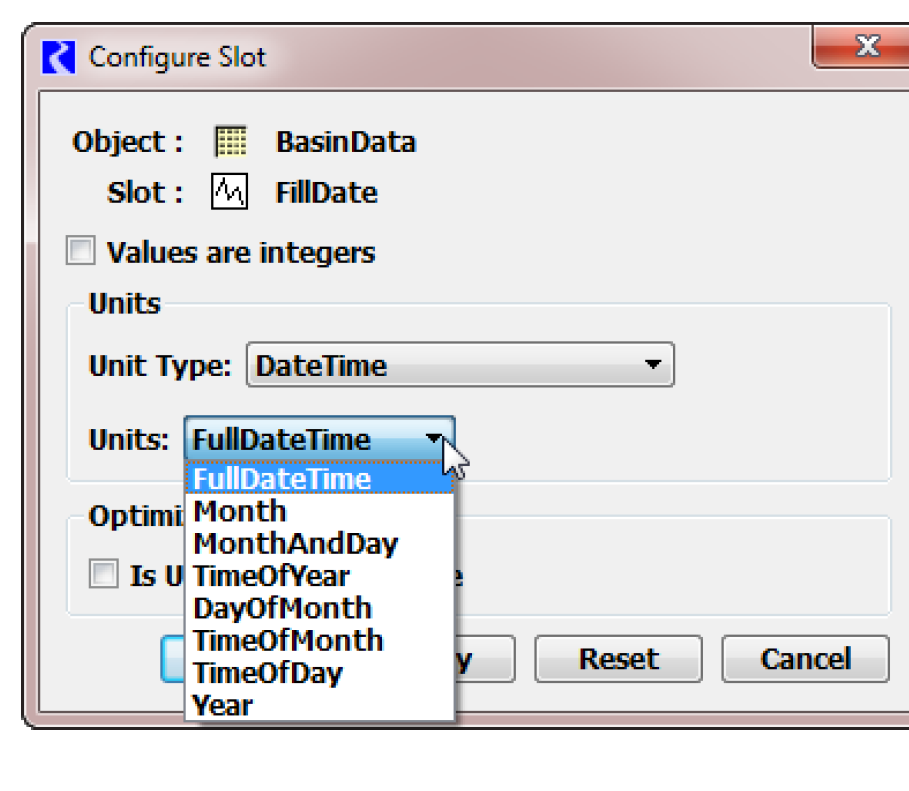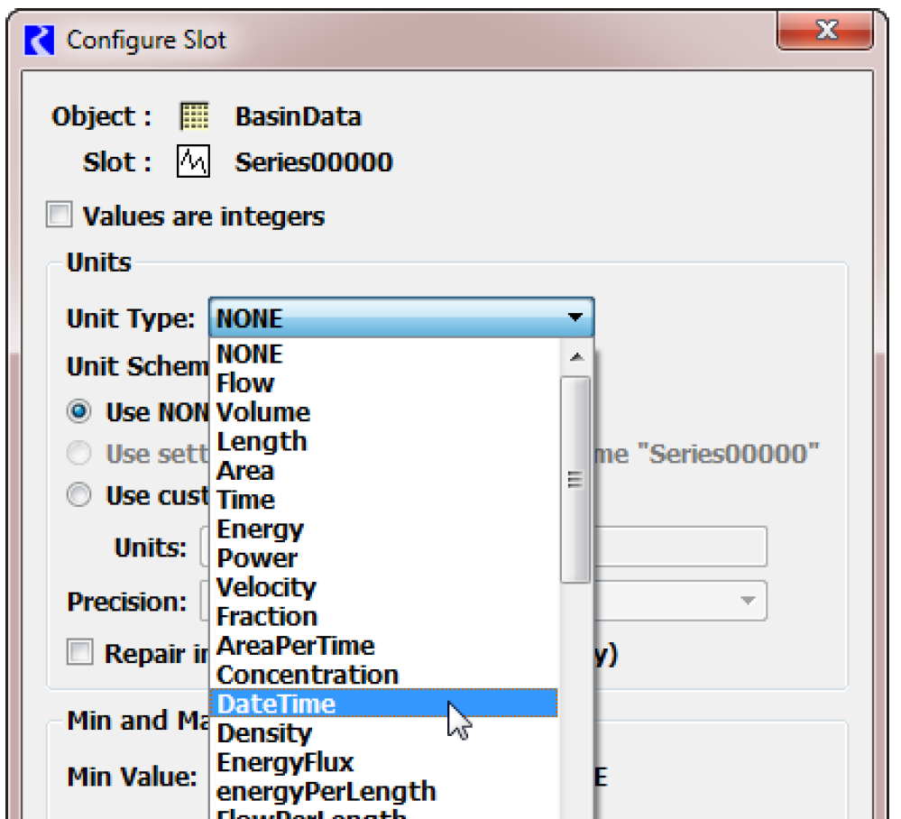 Note: The “DateTime” Unit Type, and the eight supported DateTime User Units are special in RiverWare. These selections cause the Slot’s values to be displayed and edited as DateTime values rather than as numeric values.