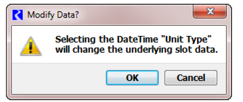 Unlike switching between ordinary Unit Types, switching to the “Date Time” Unit Type, and between the various DateTime “User Units” causes a change in the underlying Slot values. The user must confirm these changes with this dialog.