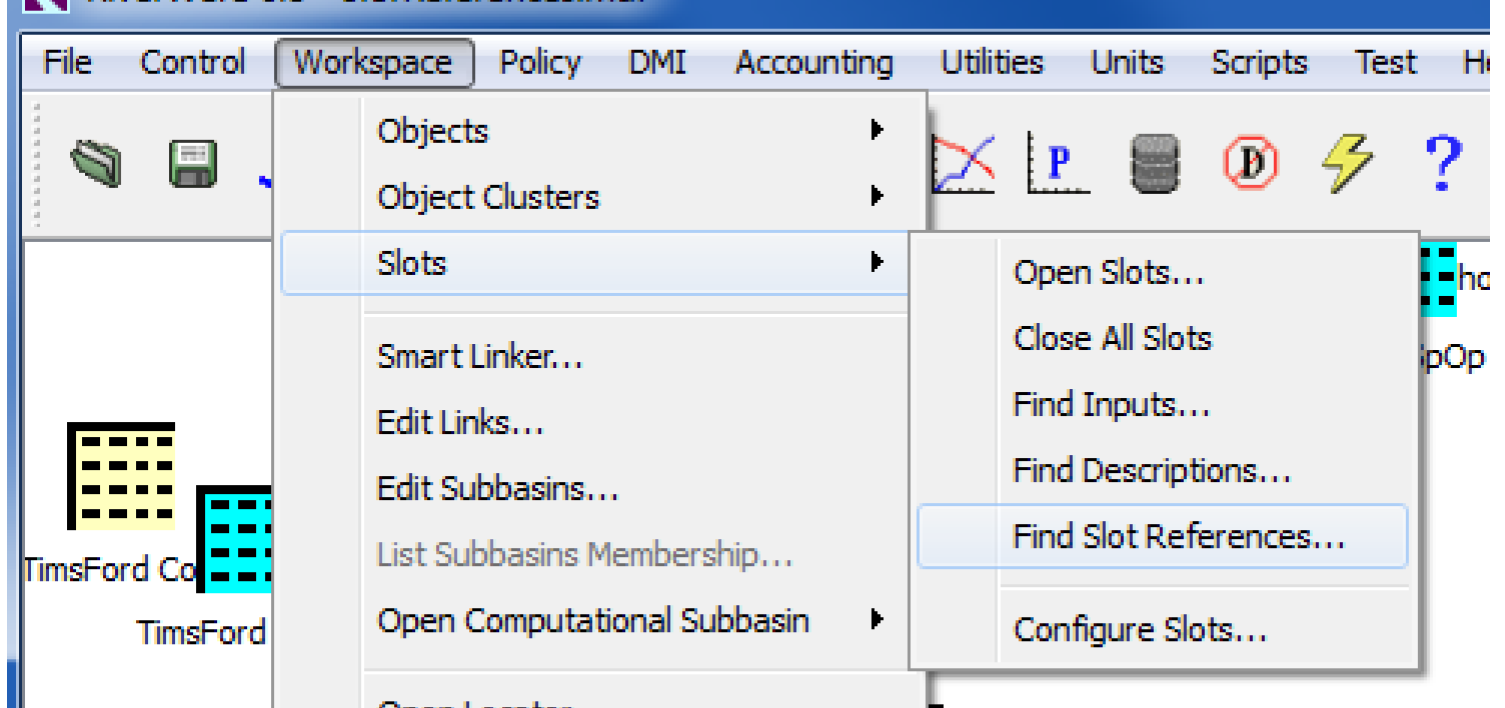 – “Slot” Any occurrence of the string “Inflow” will be found including references to the Inflow on each reservoir, reach, control point, etc in the model. But, this setting is useful to search RPL logic where the slot names are created during RPL evaluation. For example a FOR loop that is looping over reservoirs and creating the slot using the expression: Res.“Inflow”.