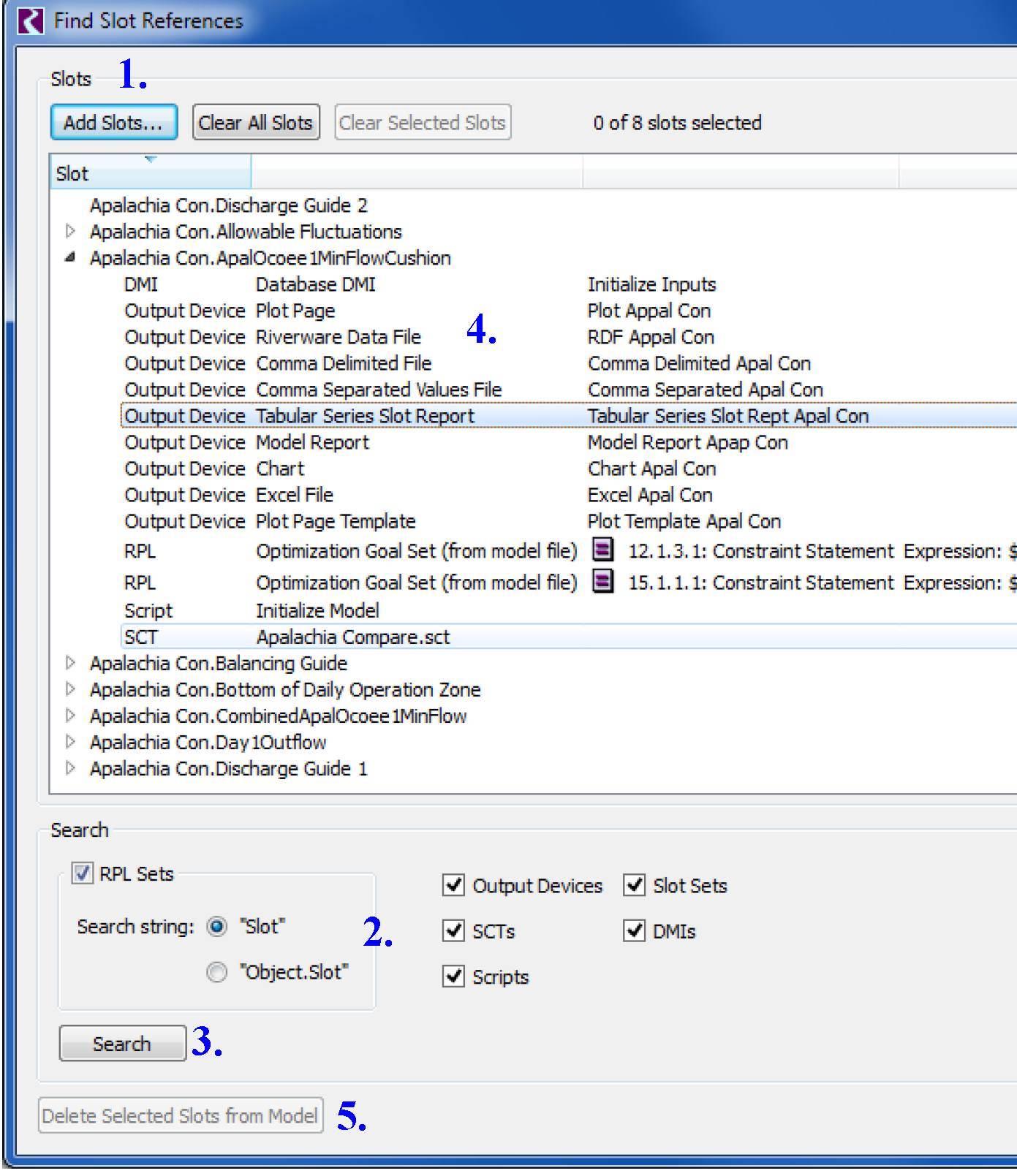 RiverWare models are often built by multiple modelers over many years. Sometimes, slots are created for a particular task. When the task is over, the slot is set aside and may never be used again, but no one wants to delete the slot for fear that it is accessed somewhere else. In addition, you may want to know where a slot on a simulation object is used. Are there any plots or output devices for Reservoir.Outflow? Is it imported or exported by any DMIs? There are many places in RiverWare where a slot can be referenced. Finding these references for a particular slot would be a very tedious and time-consuming task. For this reason, a utility was created to centralize and streamline this search process. This section describes this utility which searches through a model to find references to specified slots.