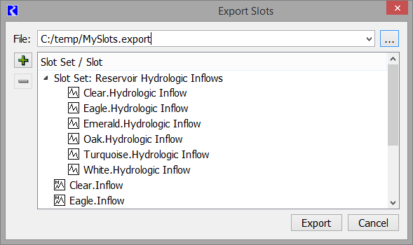 • Slots to export: Use the controls to add, remove and edit the slot selections. Slot selections can either be a new selection or can reference a Slot Set. Select the “+” button to add a selection. Then select slots or a Slot Set. The screenshot in Figure 6.60 shows a sample with a Slot Set (of Hydrologic Inflow slots) and individual Inflow slots selected. Slot sets (see Slot Sets) are shown in a tree-view that can be collapsed or expanded.