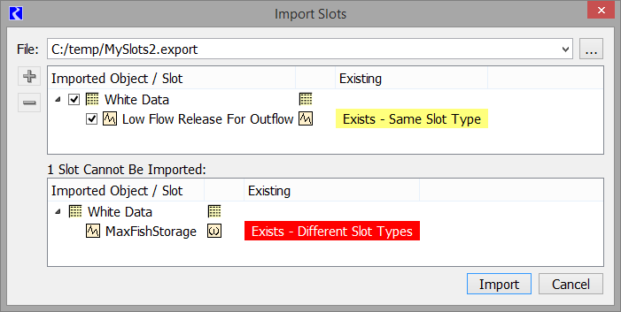 • Exists - Different Slot Types: The object and slot exists in the workspace but the slot is a different type. The slots cannot be imported.
