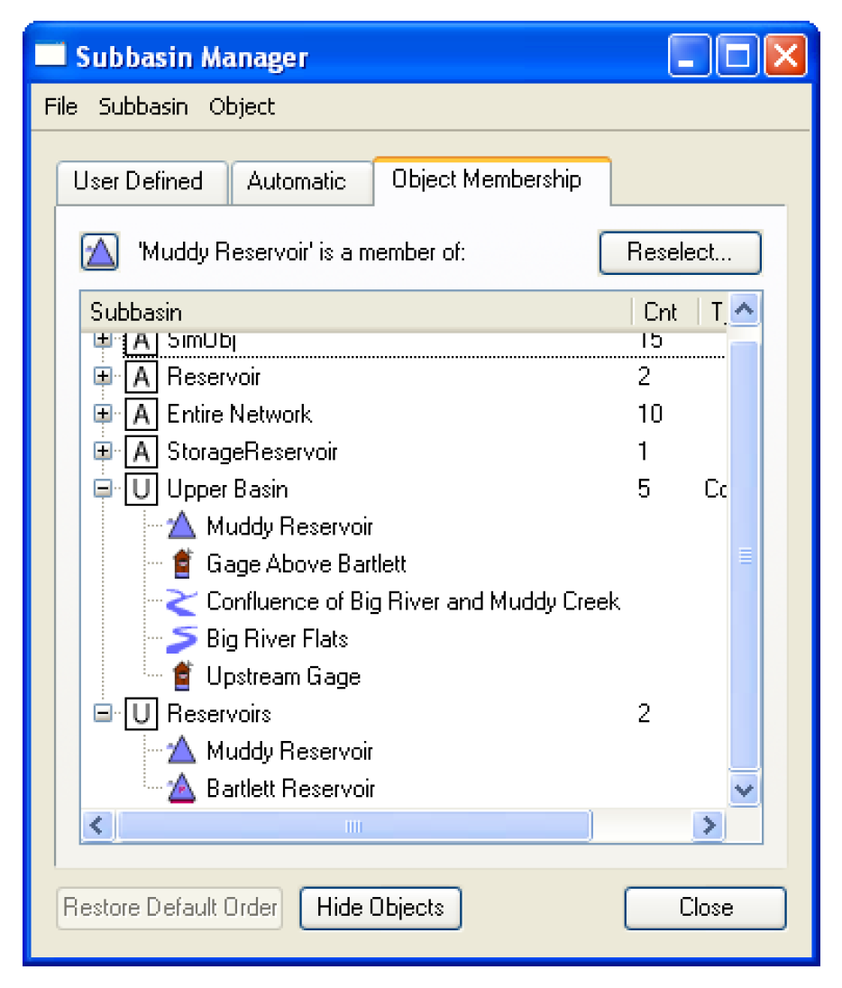 From the subbasin manager User Defined or Automatic tabs, the membership of an object can be viewed by highlighting a single object then selecting Object, then List Subbasin Membership. The subbasin manager automatically switches to the Object Membership tab. Displayed are the subbasin to which that object belongs, both automatic (A) and user defined (U). You can also access this tab directly and use the Select or Reselect button to bring up the object selector.