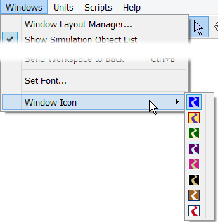 Select the icon that is shown at the left corner of the title bar on all windows associated with the RiverWare session. The ability to control the color of the RiverWare icon is particularly useful when comparing two models in two separate sessions of RiverWare. There are two ways to change the icon: