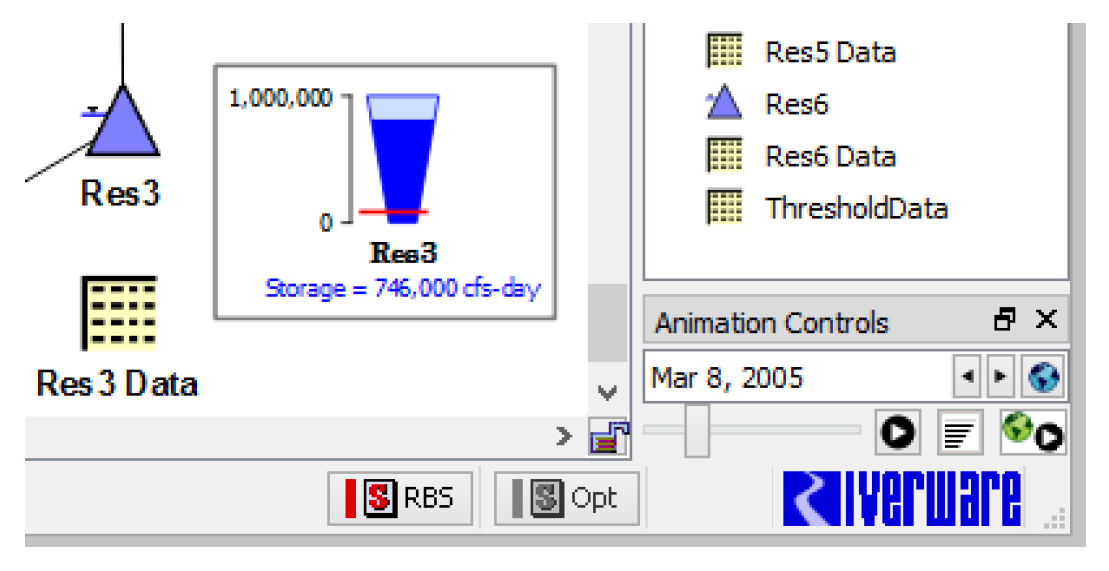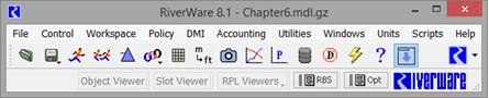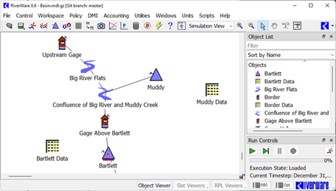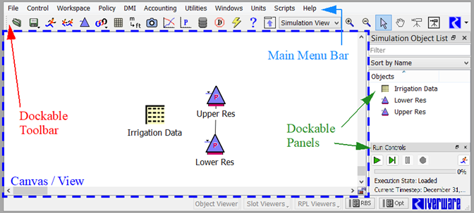The workspace features a main menu bar in which the various functions of RiverWare are organized into menus. The workspace also contains a dockable toolbar featuring shortcut buttons to some key RiverWare operations and utilities. There is also a dockable object list panel of all the objects on the workspace and a dockable run control panel. A screenshot of the workspace is shown in