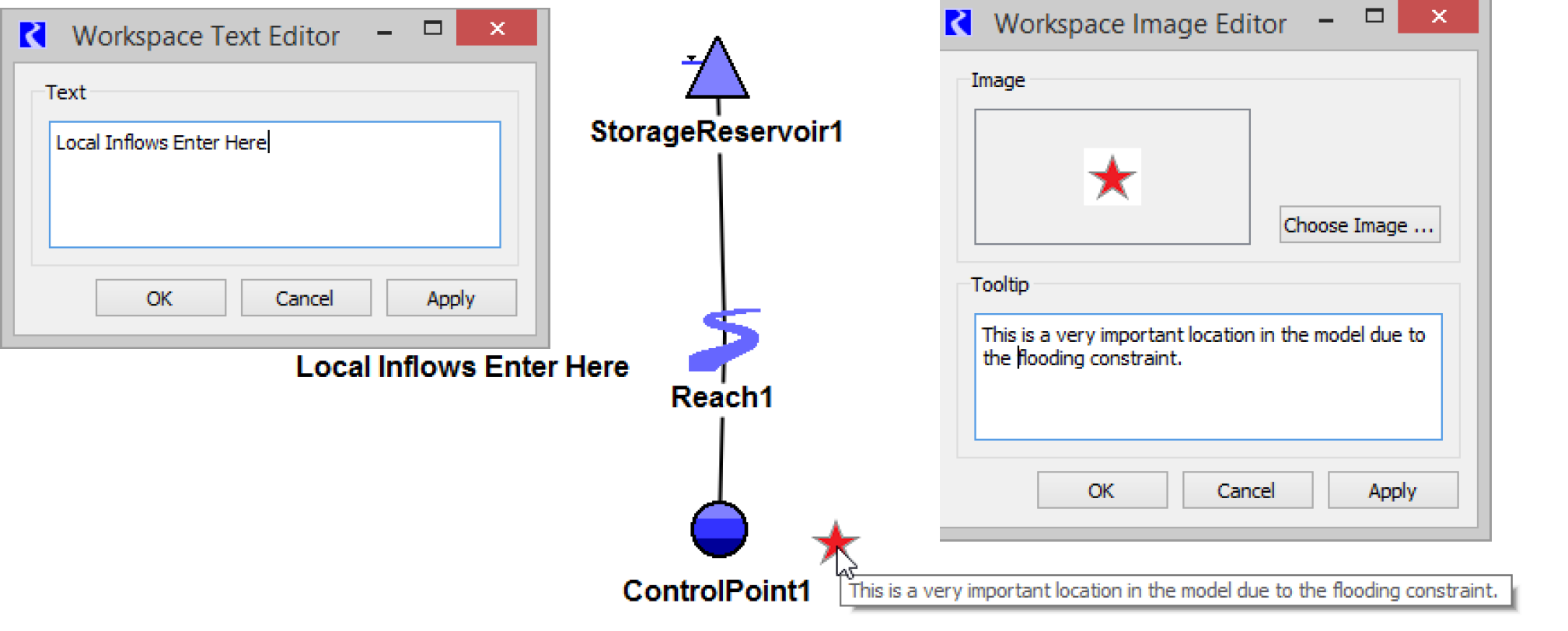 Since the Workspace is the main RiverWare interface and the hub for many actions and operations, it is often necessary to open the workspace to access other parts of the RiverWare. To show the workspace from many other dialog boxes in RiverWare, use the Show Workspace operation using one of the following: