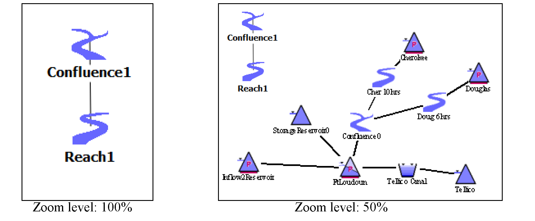At 100% zoom level, object icons are shown in their natural size of 40x40 pixels. When zooming out, e.g. to 50%, to expose a broader area of the workspace, the object icons and labels are also zoomed out and their size is reduced. When zooming in beyond the 100%, icons, labels and links remain their natural size (100%) instead of becoming larger (or thicker links). This allows you to expose more detail of background images around closely clustered objects without showing large icons. This implementation of smart zooming affects only the Simulation and Geospatial views.