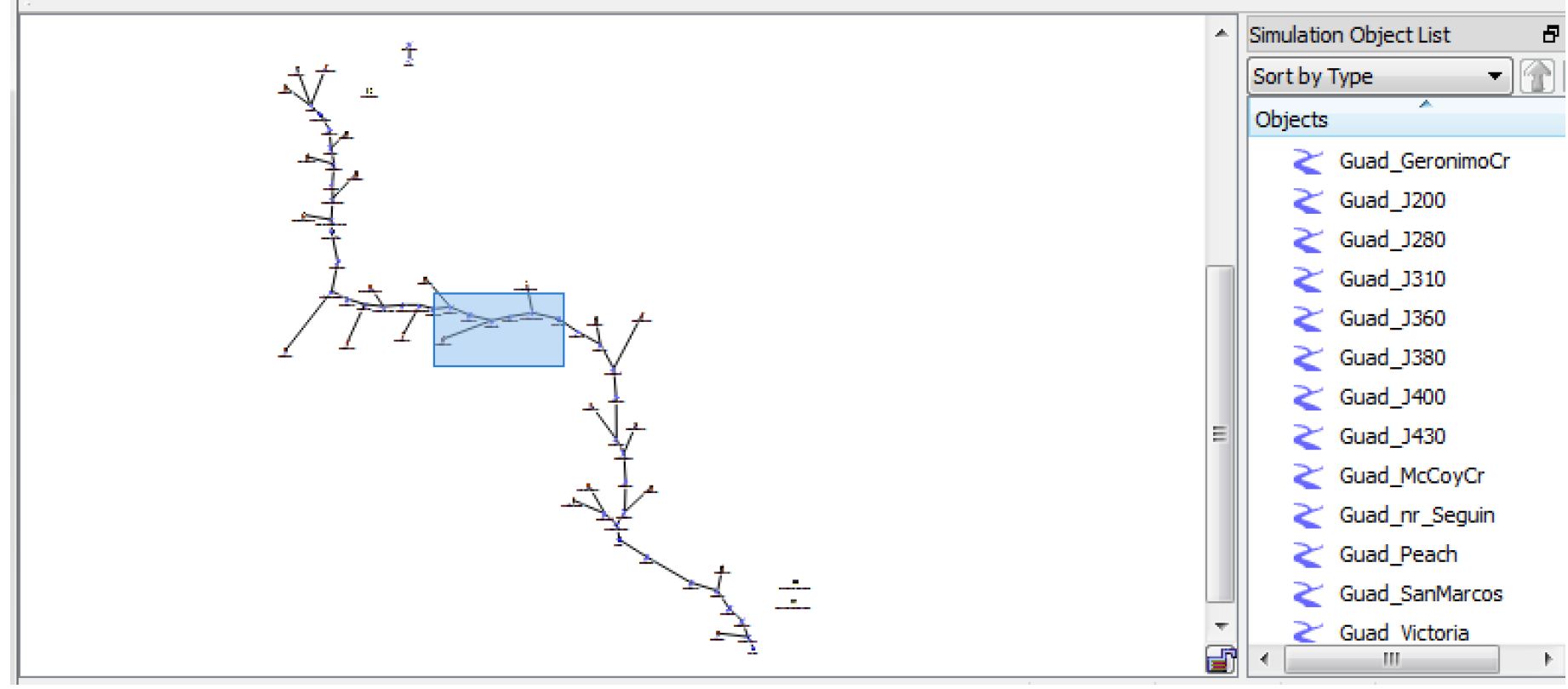 The dockable object list window provides a convenient means of locating a specific object within a model. The object list window can be detached from the workspace and be positioned at a desired location. If you undock and/or close the object list, you can show it using the Utilities, then Windows, then Show Simulation Object List menu. Selecting the desired object in the listview window automatically selects the object on the workspace. Right-clicking an object allows you to open the object without scrolling the workspace.