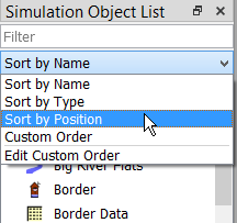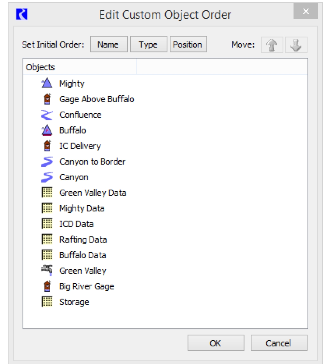 To use the Edit Custom Object Order dialog box, select an initial order using the Name, Type, or Position buttons. Then select one or more objects by selecting an object and then using Shift or Ctrl key and selecting another object. Drag and drop or use the up and down arrow buttons to rearrange. When you click OK, this order is preserved as the custom order and is shown on the Object List.