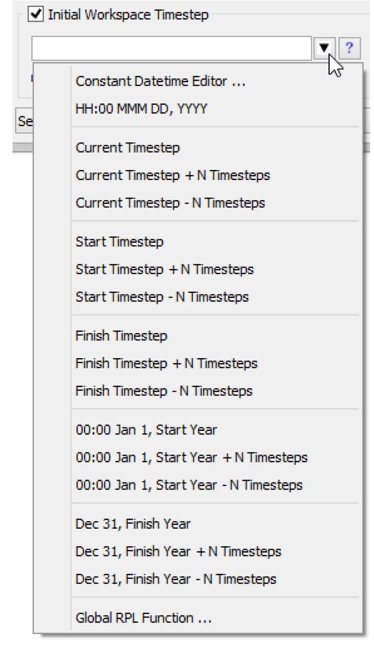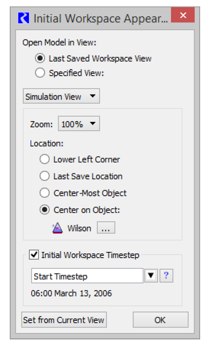 • Initial Workspace Timestep. The last option is the Initial Workspace Timestep. Define a constant or symbolic DateTime to which the model should scroll when first opened. When loading a model file containing this specification, the date is evaluated and all windows are Global Time Scrolled to that date.