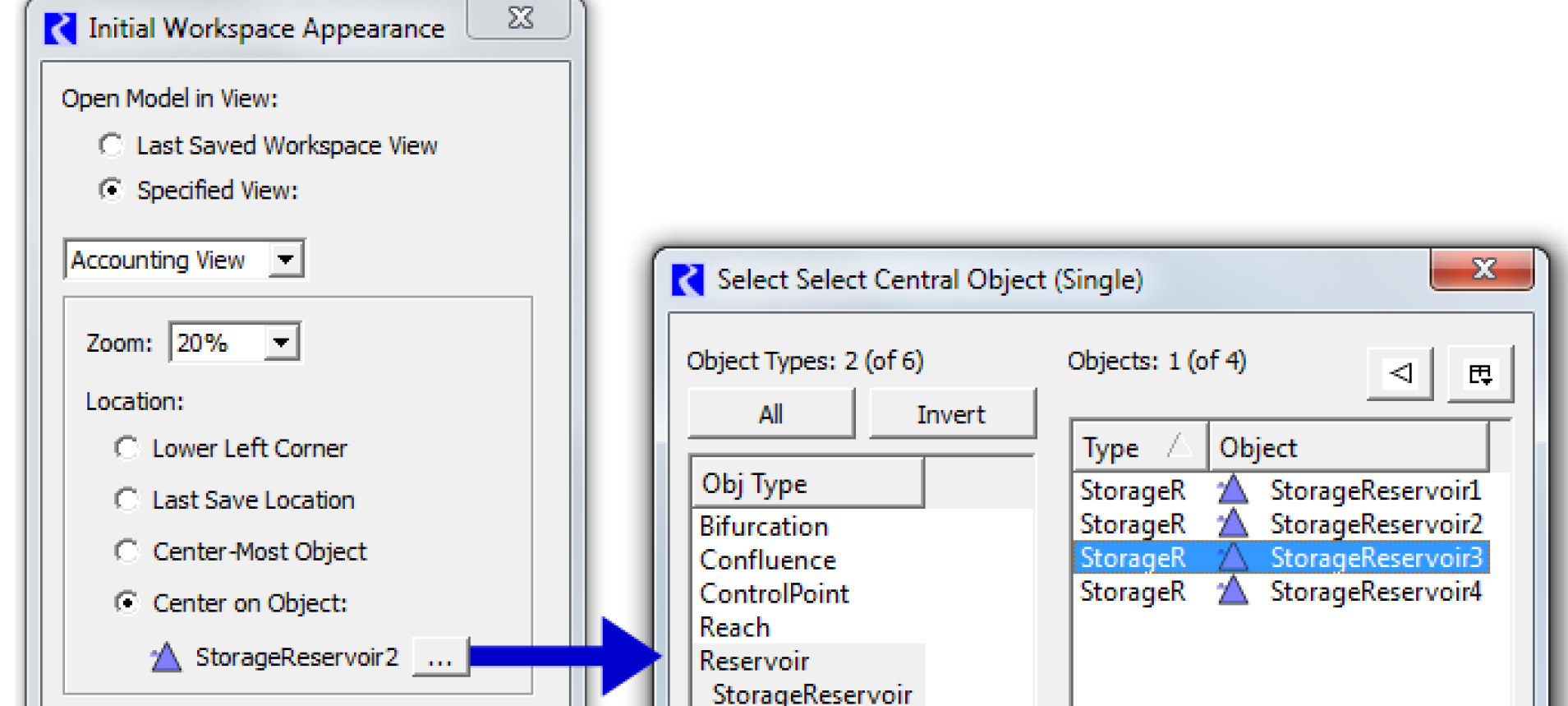 • Center on Object. Scroll so a specified object is at the center of the workspace. When this option is selected, use the button to bring up the object selector to specify the center object.