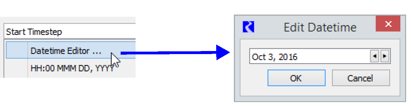 The Datetime Editor option opens a separate dialog to specify the DateTime using a selector configured for the model's timestep size.