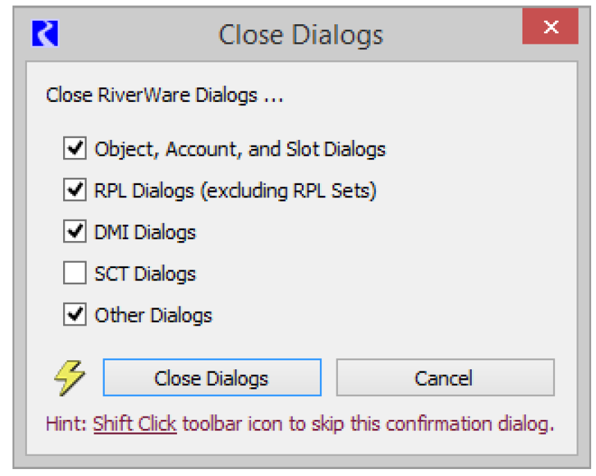 • RPL Set editors. Actually closing those dialogs would also remove the RPL Sets from the RiverWare session.