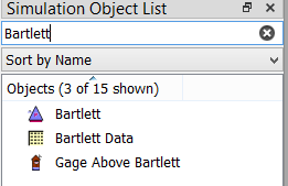 At the top of the Simulation Object List, enter text into the text box to filter the object list.
