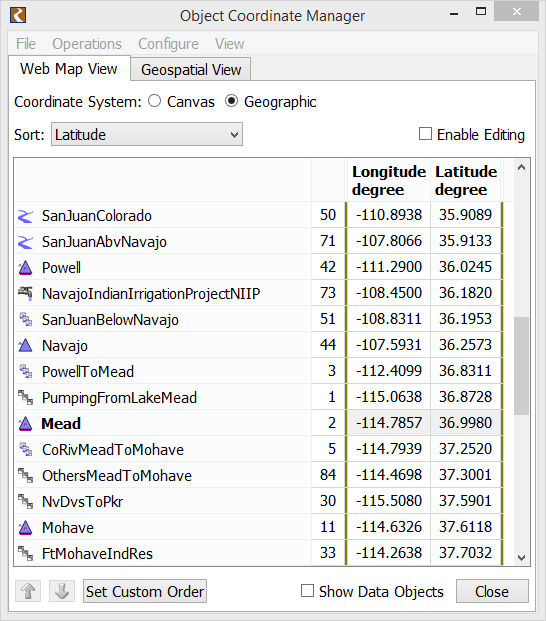 The Object Coordinate Manager dialog displays either canvas coordinates (x, y) or Longitude and Latitude. Select the Enable Editing checkbox to edit the coordinates.