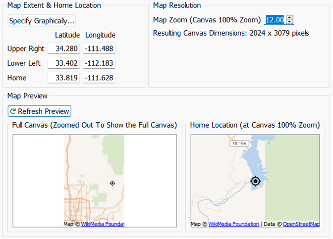When setting up the map and home location, use the Refresh Preview button to show two maps: Full canvas and Home location at 100% zoom.