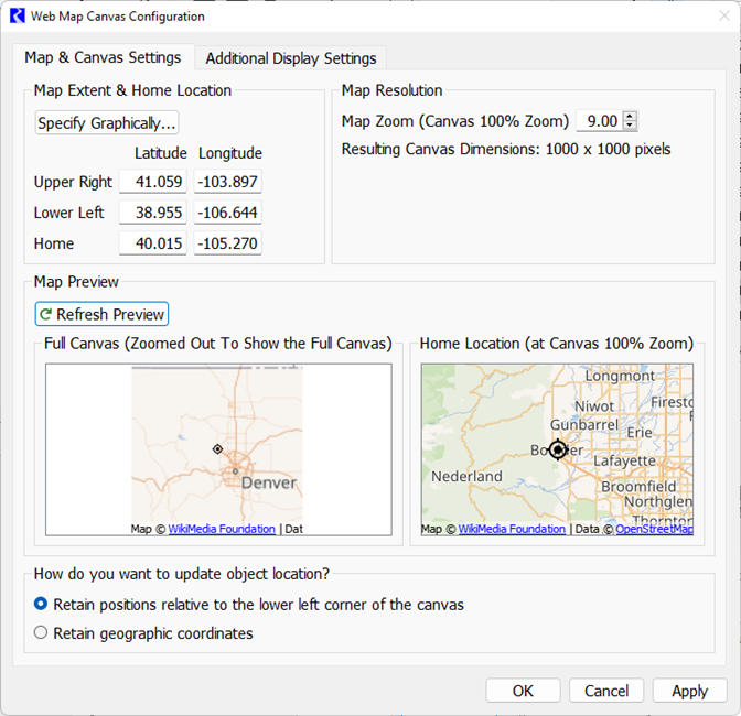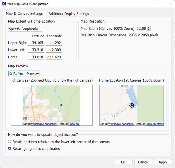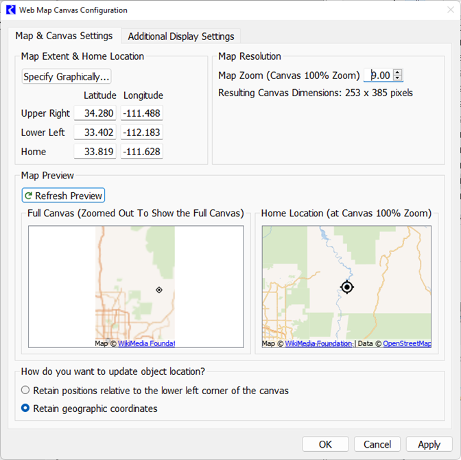 When you select OK or Apply, any changes to the zoom level or bounding coordinates could result in changes to either where in the view objects are or to the geographic coordinates of the objects. Select from the two choices on how to update object locations: