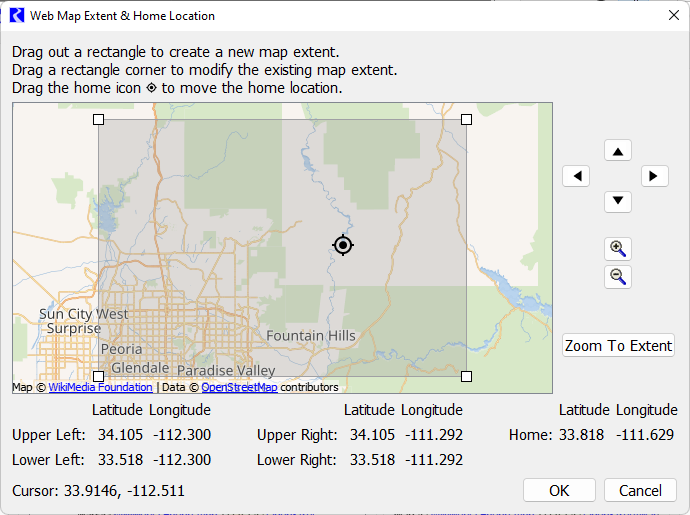 Figure 2.25 Screenshot of the Web Map Extent and Home Location Dialog