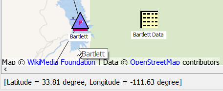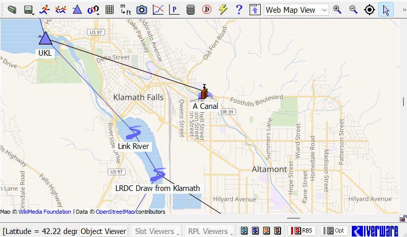 To support the Web Map View of the workspace, RiverWare saves both the canvas coordinates and geographic coordinates for each object on the workspace.
