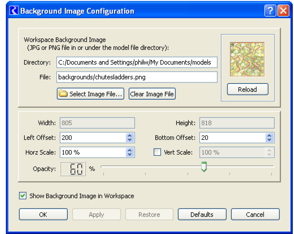 The Simulation Workspace supports the ability to show an image loaded from an image file (JPEG or PNG) as the background. The utility is accessed by right-selecting the workspace and choosing Background Image.
