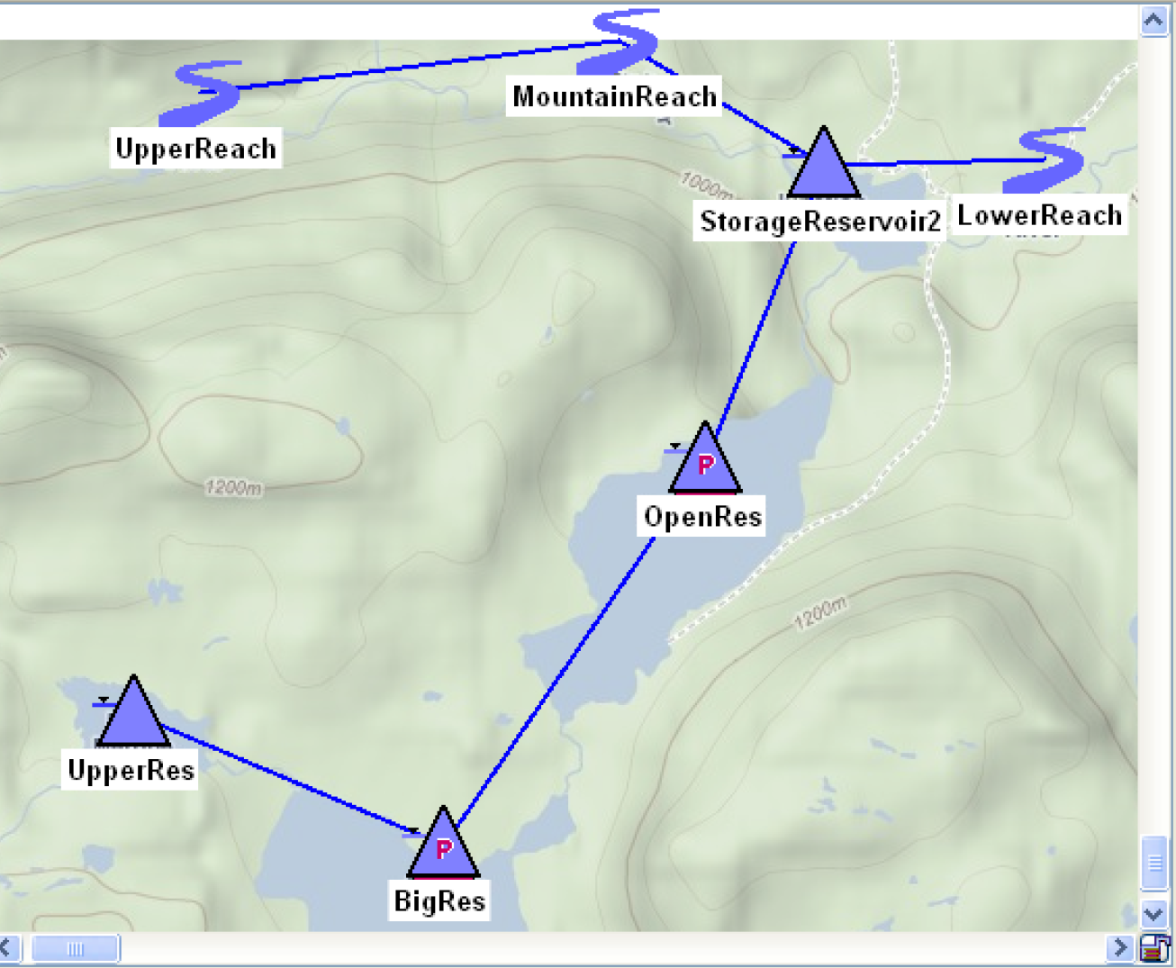 • The Simulation View displays a schematic of the basin; objects are linked together to form a network.