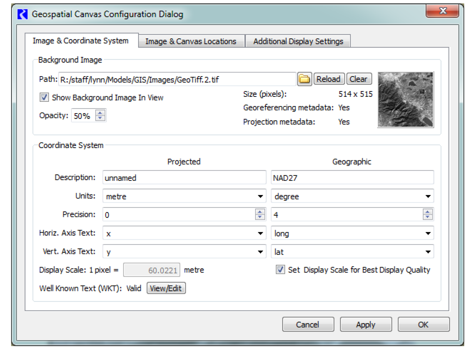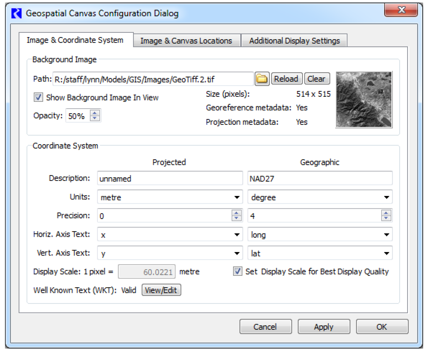 • Select Coordinate system. Coordinates are displayed for either the canvas or geographic coordinate system.