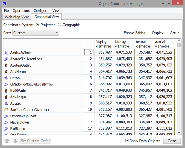 To support the Geospatial View of the workspace, RiverWare associates coordinates in the view’s projected coordinates system with each object on the workspace. To provide more flexibility for the user, RiverWare supports both Actual and Display spatial coordinates. Actual coordinates are the static coordinates of the object which may come from other sources. The display coordinates are the location where the object is shown on the geospatial view. Often the display coordinates differ from the actual coordinates because the object was moved slightly for less icon clustering or better display.