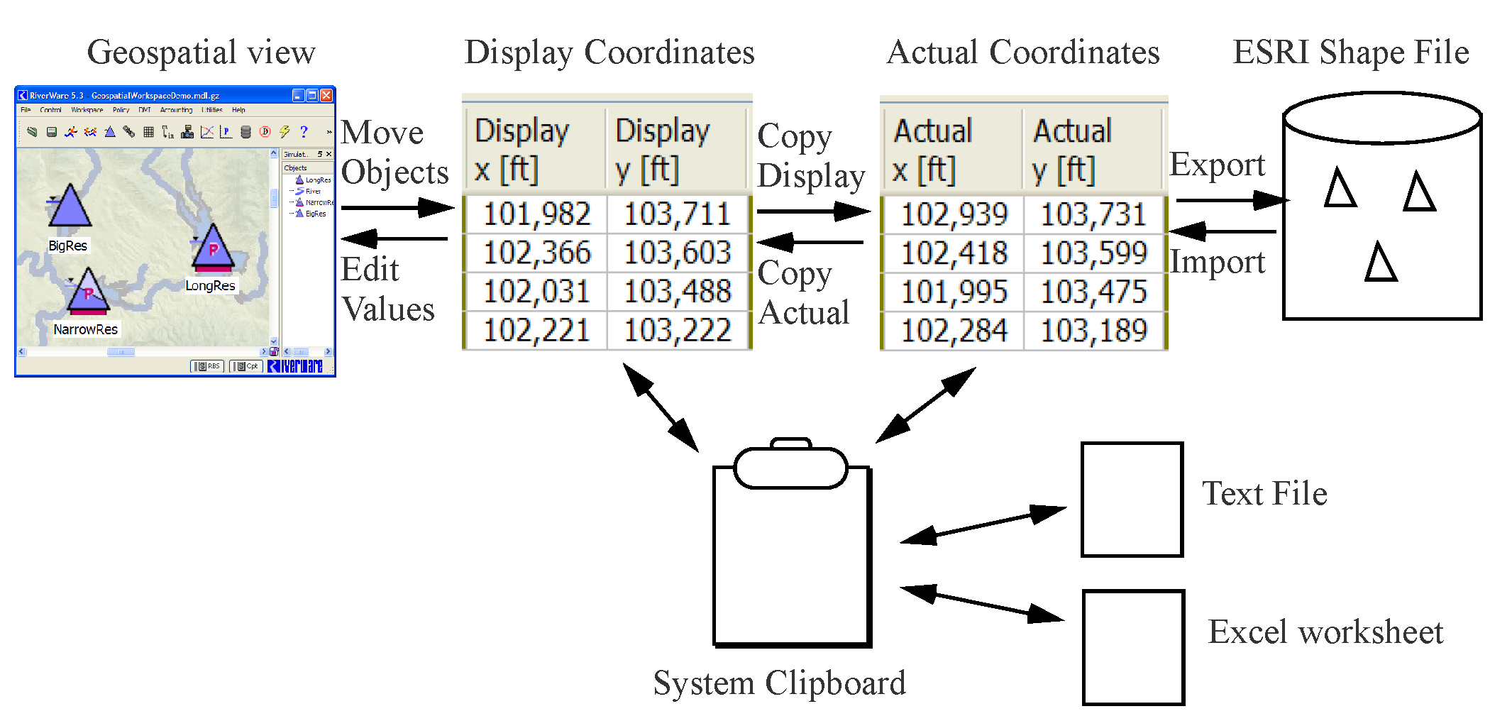 RiverWare supports export of the spatial coordinates of all or selected objects. When coordinates are imported, the user will be warned that the existing coordinates will be overwritten and notified when coordinates for unknown objects are encountered.