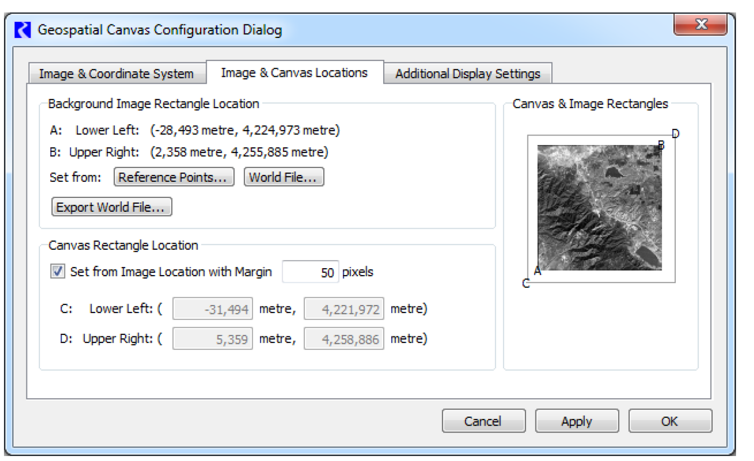 • The Geospatial canvas has an associated map projection and location (rectangular extent) within the projection’s coordinate system.